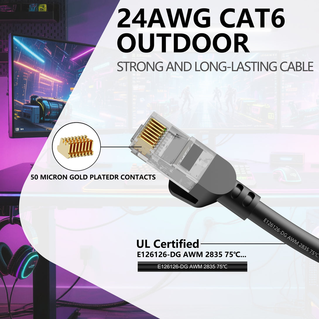 Cat 6 Outdoor Ethernet Cable, Support Cat8/7 Network, 10Gbps 550MHz, 24AWG Pure Copper, Direct Burial Waterproof In-Ground UV Resistant LAN Patch Cable for Router, Modem, Switch